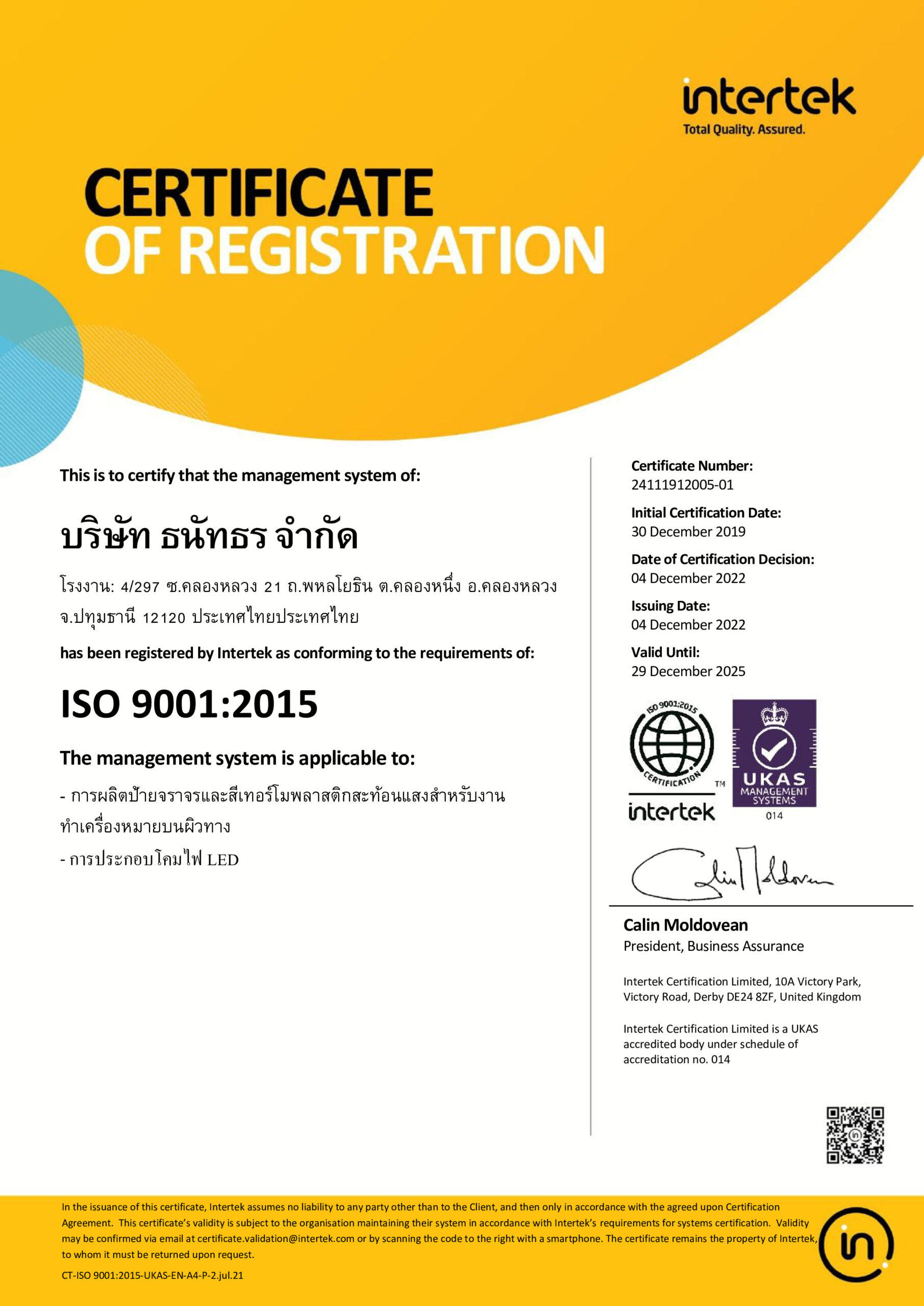 บริษัท ธนัทธร จำกัด ได้รับการรับรองมาตรฐานระบบคุณภาพ ภายใต้มาตรฐาน ISO 9001 : 2015ใน 3 ขอบเขต คือ